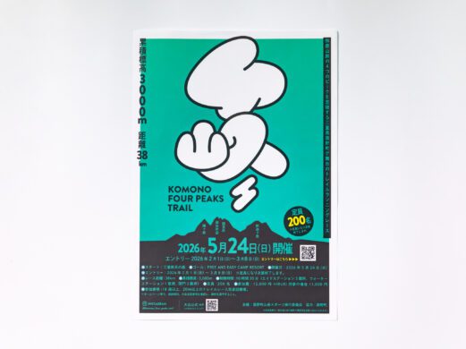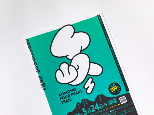 大会のコースマップです。給水ポイントやトイレの位置をわかりやすく掲載しています。4つの峰の位置にはロゴデザインの4をイメージした形を配置し、大会のブランドイメージをマップにも反映しました。