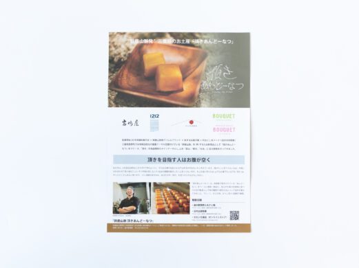 Flyer 鈴鹿山脈発 三重県の新しいお土産「頂きあんどーなつ」のチラシです。 頂きあんどーなつは、山でも麓でも食べられるお土産として開発されました。 チラシは「どんなシーンでも自分の頂きを目指す人に食べてほしい」という商品コンセプトを体現したデザインです。 -