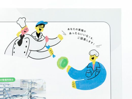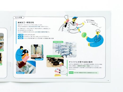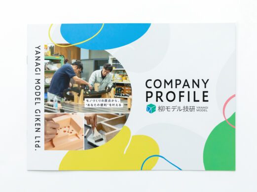 柳モデル技研様の会社案内としてのパンフレットです。イラストや写真を使用し、明るいイメージでわかりやすく事業内容を伝えています。新規営業や採用活動にも活用いただけるパンフレットになっています。